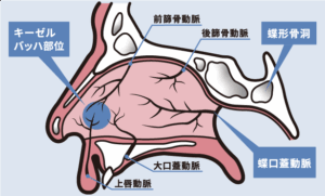 子どもの鼻血の9割以上は、鼻の穴の入り口から約1cm奥にある粘膜の薄い部分「キーゼルバッハ部位」からの出血です。この部位を外側からしっかり押さえる「圧迫止血法」が最も効果的です。